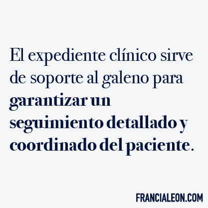 | Datos personales Historia clínica Imágenes (rayos X, resonancias magnéticas, entre otras) Resultados de análisis de laboratorio (orina, sangre, entre otros) Reportes de evaluaciones y exploraciones físicas Registro de transfusiones de sangre o sus componentes Informes y notas médicas Notas de enfermería Documentos contentivos de consentimientos informados[2] Diagnósticos Tratamientos e indicaciones Historial de visitas médicas Documentación administrativa y financiera Entre otras informaciones | Es individual y confidencial Es integral (contiene información científica, administrativa, financiera y legal) Es organizado y secuencial Es una obligación de los prestadores de servicios de salud su creación y preparación (base legal: párrafo 6.1.3 del Reglamento Técnico para la Gestión del Expediente Clínico) Es propiedad del paciente o usuario (base legal: párrafo 7.2.1 del Reglamento Técnico para la Gestión del Expediente Clínico) Es custodiado por el establecimiento o prestador del servicio de salud, quien tiene el resguardo legal del expediente (base legal: párrafo 7.2.2 del Reglamento Técnico para la Gestión del Expediente Clínico) |